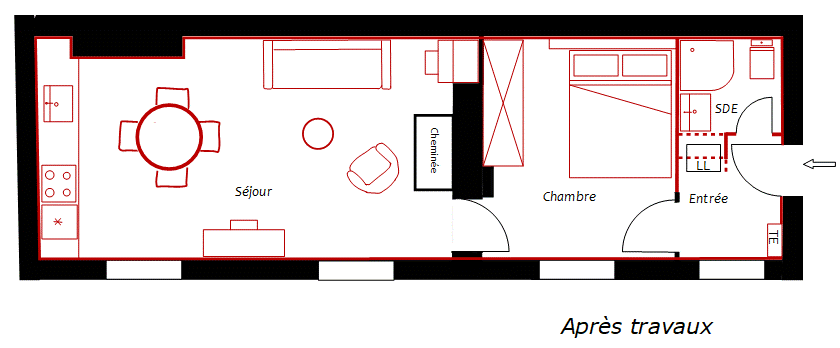 isolation des murs par l’intérieur, changement des fenêtres, découplage de l’appartement principal pour l’électricité et le chauffage, création d’une cuisine ouverte sur un beau séjour, nouvelle salle d’eau.