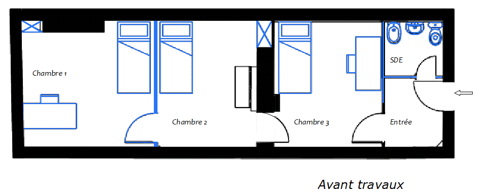 Cette enfilade de 3 chambres avec salle d’eau, annexe d’un grand appartement, est devenue un appartement à part entière, avec une belle pièce à vivre, après d’importants travaux de rénovation :