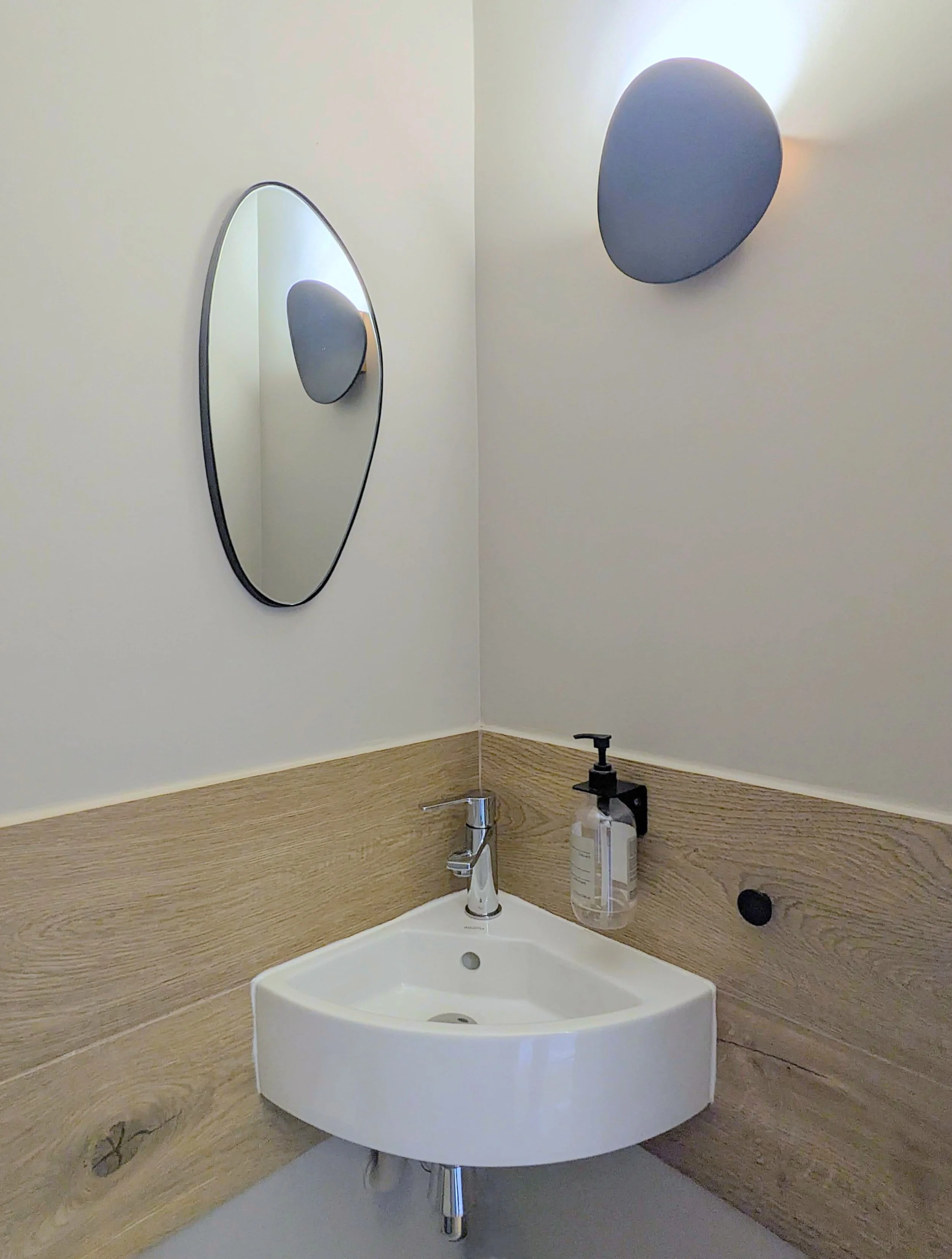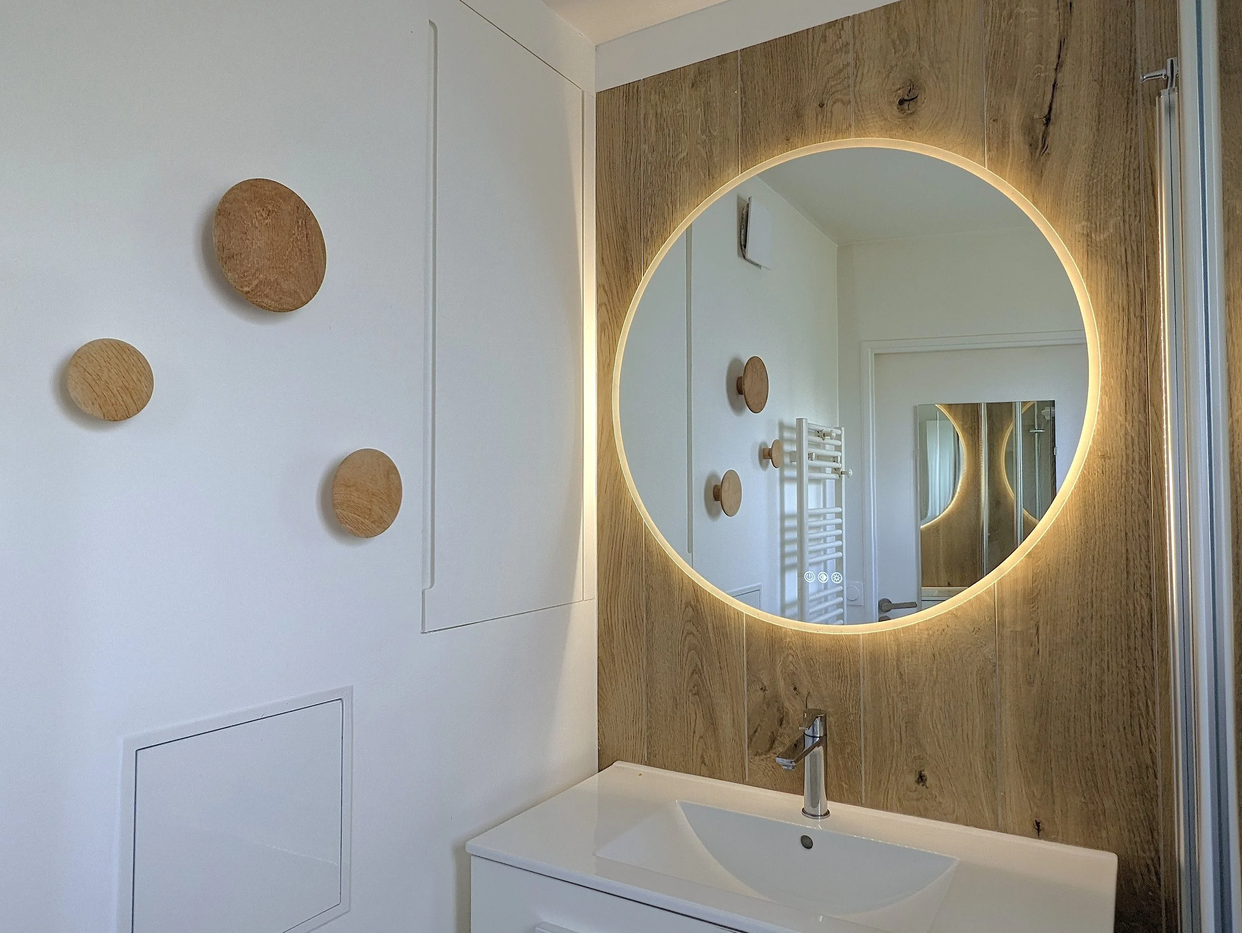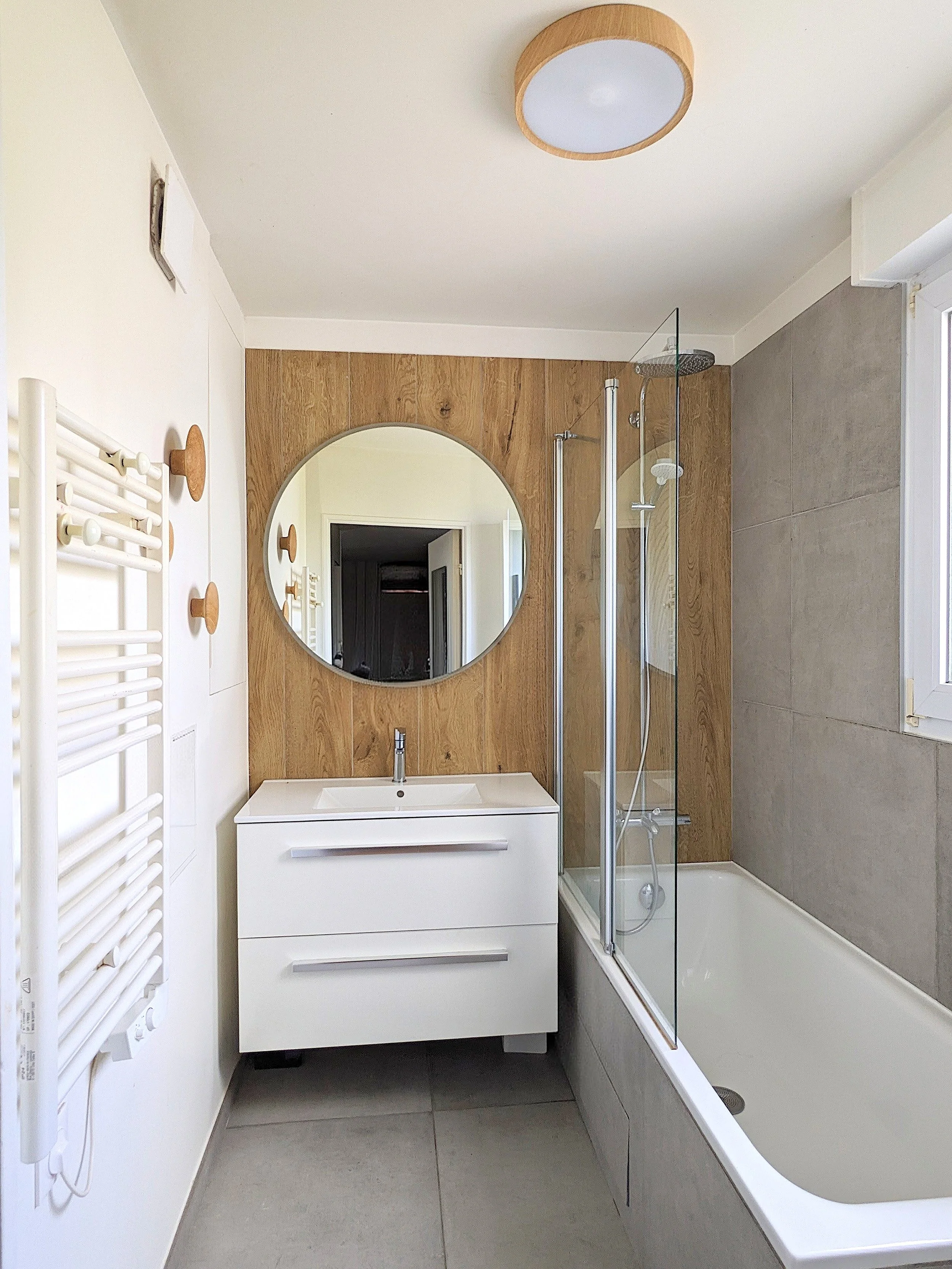 la vasque de la salle de bain était située devant la fenêtre, avec un petit miroir sur le côté. Place maintenant à un grand meuble vasque et un beau miroir rond lumineux !