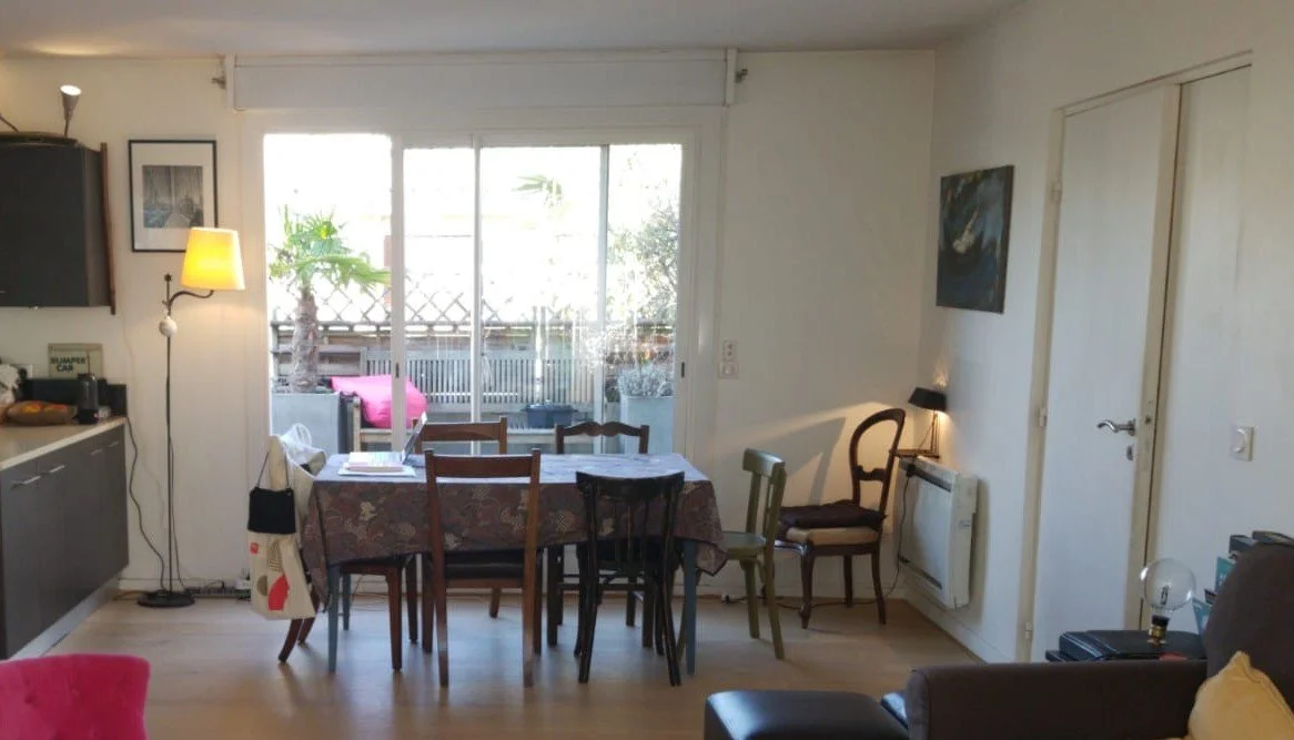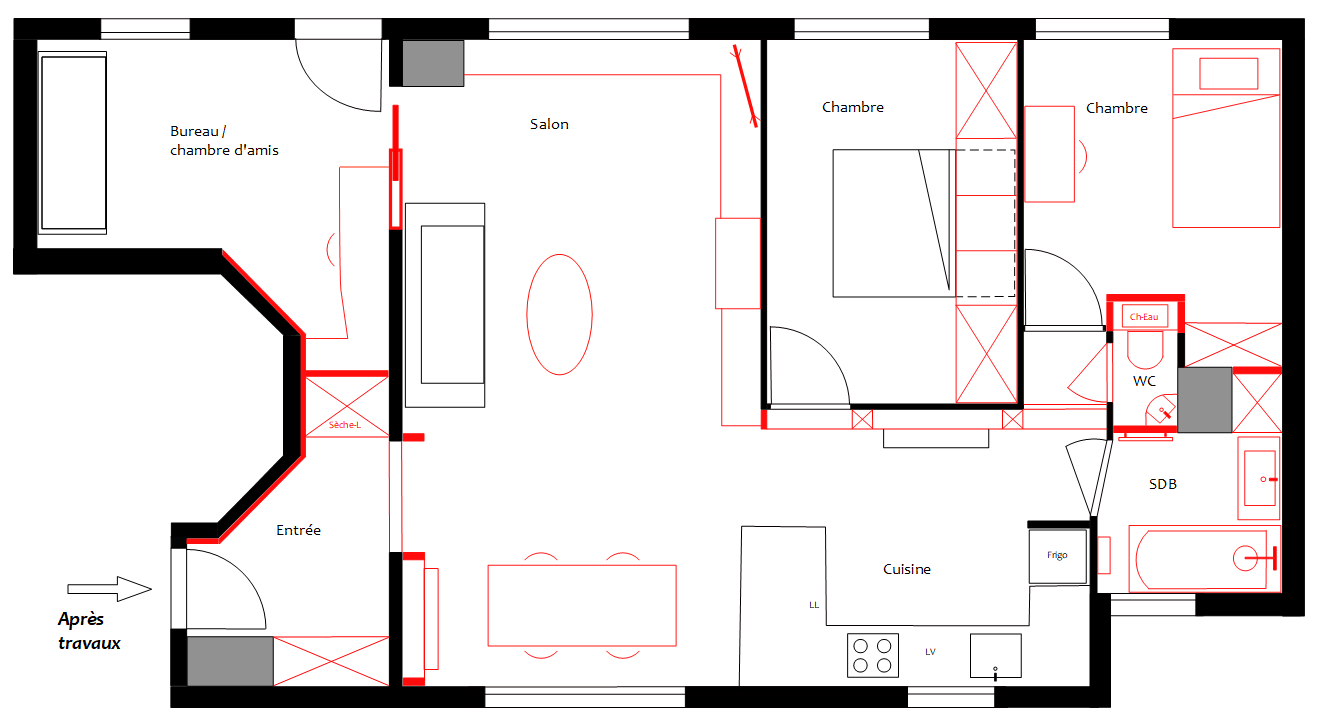 L’entrée mitoyenne de la cage d’escalier de l’immeuble était assez fraiche en hiver. Nous avons isolé les murs concernés et ajouté un rideau devant la porte d’entrée et cet inconvénient a disparu. La double porte menant au séjour permettait de limiter la sensation de froid, mais elle était ni pratique (s’ouvrant sur la table de salle à manger) ni esthétique. Nous l’avons supprimée.