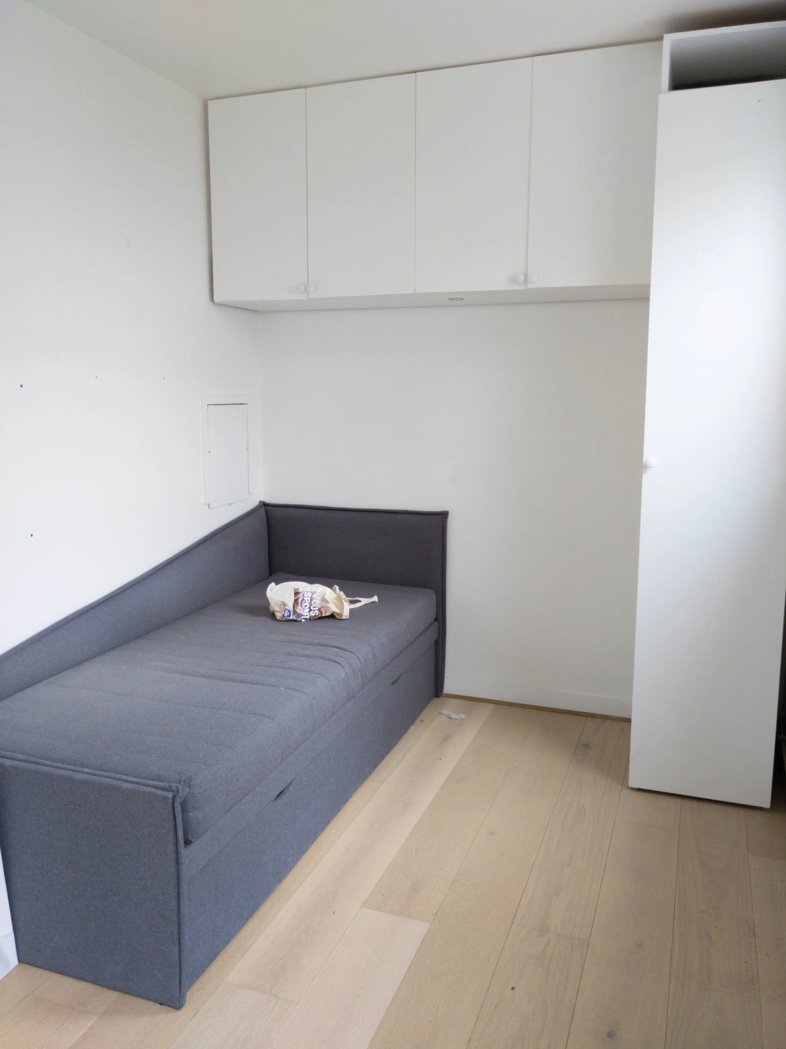 La fermeture du passage vers le bureau a permis d’installer un second placard cachant le sèche-linge et la table à repasser.