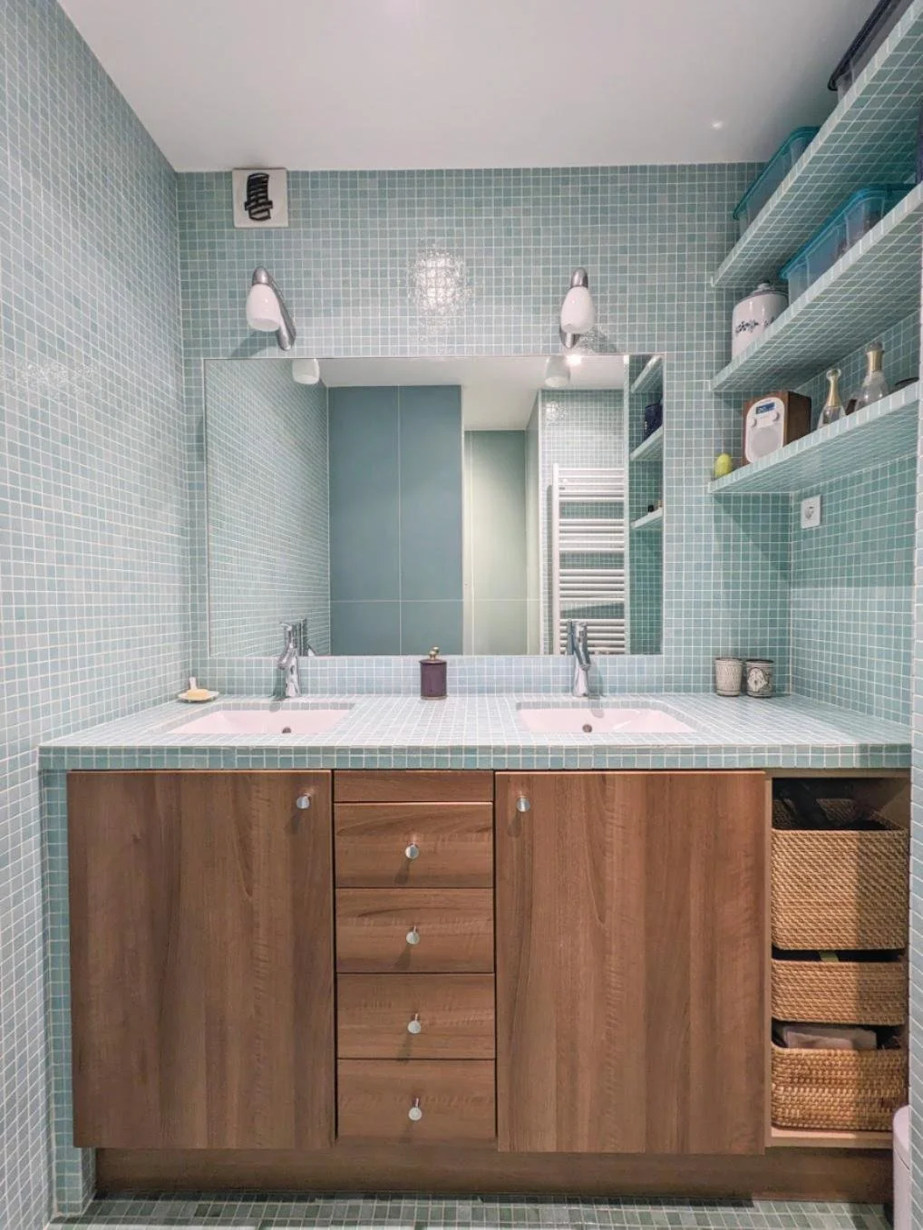 Dans la nouvelle salle de bain, les rangements ont été optimisés avec une grande armoire de toilette et un placard pour les produits d’entretien sous la vasque.