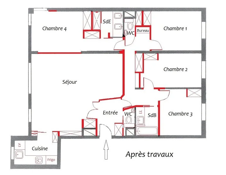 L’ancienne salle d’eau comportait des WC qui ont été déplacés dans l’entrée. Cela a permis de diminuer sa surface au profit de la chambre mitoyenne qui était vraiment petite (moins de 9 m²).