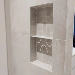 Dans la douche, la niche avec étagère métallique est complétée par une étagère d’angle assortie.